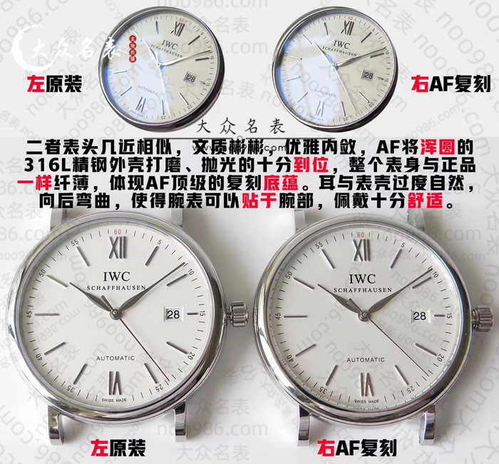 前言:万国柏涛菲诺一直以MKS厂最为出名,MKS的价格在2000区间,而AF的在2000+区间。两者最显著的成本区别就是,MKS用9015机芯,而AF采用2892海鸥机。前者标配牛皮,而AF的标配鳄鱼皮。先看看AF的参数介绍:腕表尺寸40mmX9.5mm。整个表身与正品一样纤薄。与原装一致采用最顶级的美洲短吻鳄鱼皮表带,搭配AF制表师精心打磨的精钢针扣。【机芯方面】采用逆时针调日历的TOP级海鸥2892机芯,实现所有功能和操作方式与原装一致。厂家只推出最好卖的两色黑白表盘。