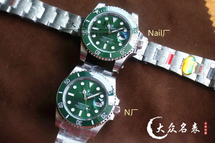 这个厂家估计你没听过,其实我也没听过。第一次听说还是客户问我的,当时我还一面蒙蔽,Nail厂?钉厂?有这么逗逼的改名方式哦。很明显是蹭热度去改的,用了N厂的N字。然后我自己又去了解了一下,然后跟厂家拿了一个大货的样板拆解看看。之所以会引起我注意,是因为以下这段厂家的文案:(陶瓷圈:绿色陶瓷圈达到正品99% 的翠绿,黑水鬼达到100%无色差。与原版一样镀白金刻度,耐脏,不发黑,夜光珠饱满晶莹剔透。转圈:潜水转圈有吸引力,每一齿的刻度定位清晰,和原版一样有一种被拖住的感觉,转动时不会感觉生硬或跑位(这一点目前只有NAIL厂做得到),声音和原版一样清脆悦耳。材质:全表904L精钢(包括把头,生耳,螺丝……待检测报告)重量与正品一致,约155克机芯:改装3135机芯,与正版一致的Parachrom 蓝铌游丝。调时间方向与正品3135一致。超过72小时长动力储备,三天三夜不会停(续航72小时以上,星期五把手表摘下星期一佩戴依然准确无误)。表壳:内影英文字放大一百倍与正品对比一致。在内影六点位每个表都有一个独立编号(一表一号不重复)蓝宝石玻璃附有防伪隐形LOGO。表带:拉丝纹理清晰,与表壳无缝对接(配NAIL精致螺丝刀可自行拆卸表带长短)。表扣:无缝对接,无电焊痕迹,安全扣LOGO精致无比,有瞬间调节表带长短功能字面:夜光强大,透亮无比。与原版亮度一致(NAIL配有蓄光灯可以测试)️日历:超大日历窗口大小与正品一致,字体印刷与原版一样凸起,被放大六十倍依然不会产生流墨和毛边现象底盖:与正品一致标准的144牙,齿纹清晰,无毛边处理。总结:NAIL在技术和细节上完胜一切复刻界版本,达到复刻界巅峰荣耀)