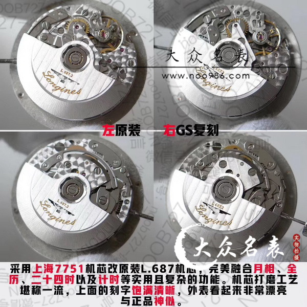 GS厂精心打造浪琴名匠月相2019最新款L2.773.4.78.6腕表【表壳】腕表尺寸40mmX14.5mm 表壳由品质出众的316L精钢精磨细造,光泽明亮,呈现原装柔和优美的线条。直立式表耳与表壳一体成型,佩戴贴手,极为舒适【机芯】采用上海7751机芯改原装L.687型机芯,所有功能同步原版。【精彩细节】1.机芯功能与原装吻合——完美融合月相、全历、二十四小时以及计时等多种实用功能 2.八只高温淬火锻造而成的蓝钢指针,深邃有致,熠熠生辉。3.市场独家——自动陀与原装同步。这款属于集大成的作品,基于市面所有版本的不足改进而来。最显著的特征是自动陀与原装都采用了镂空设计,同步了专柜的新版设定。价格方面跟3M出品的差不多。
