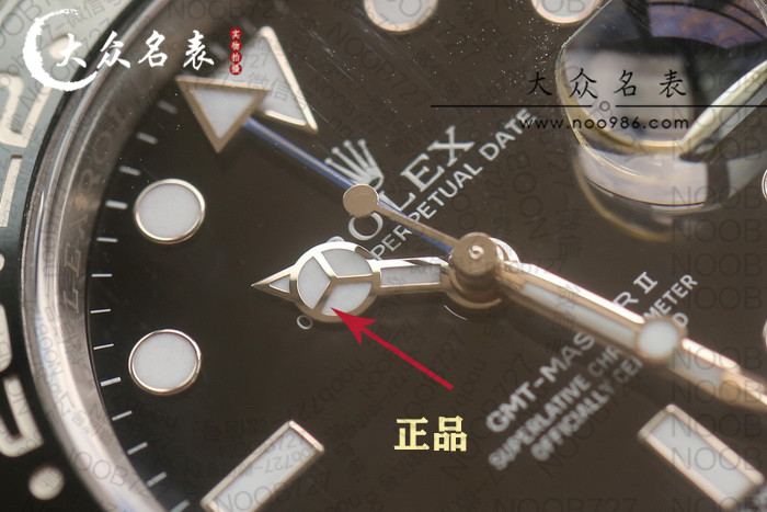 只有N厂可以做到跟原装一样,就是时针在最下面,GMT针叠时针。N厂号称复刻3187/6机芯就是为了实现这个功能,不过为了这个功能代价真的有点儿大,整表售价去到三千多。