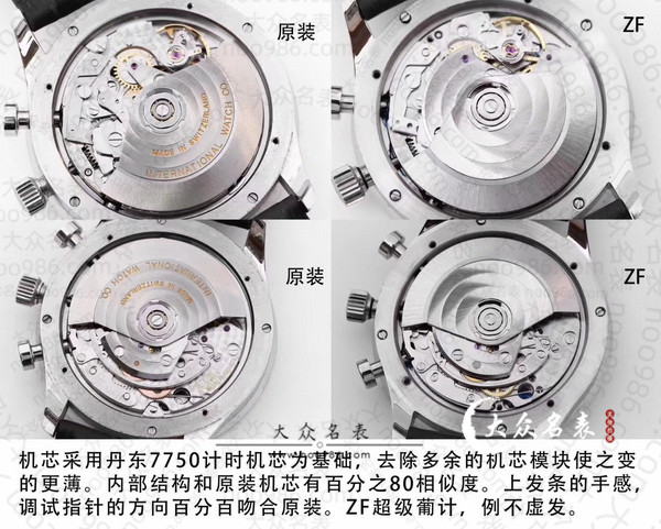 机芯采用丹东7750计时为基础,去除多余的机芯模块变成更薄,内部结构和原装有80%相似度。上发条的手感、调试指针方向完全吻合。ZF超薄葡计,仅此一家。