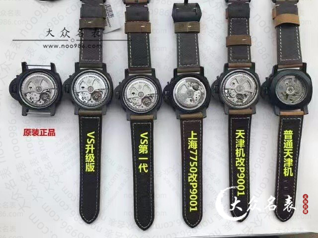 介绍VS厂的机芯之前要给大家科普一下沛纳海的机芯型号,最近的沛纳海都是以P来命名的,比如P3000就是手动机芯,而P9XXX系列机芯就是针对自动机芯的型号。原装的沛纳海也从原来的P9000升级到P9010,然后这个机芯又衍生出P9001/P9012等的型号,这些型号都是基于新版机芯加上GMT 或者动力储备显示等功能做出的修改,所以技术规范等都是基于P9系列去设计的。