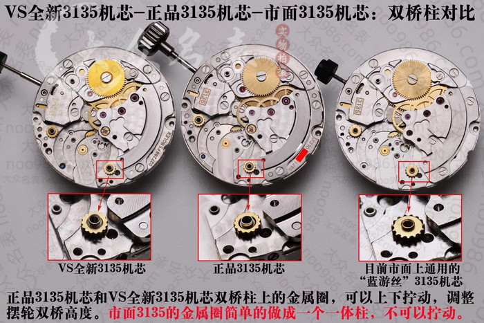 正品3135的机芯和vs全新3135机芯双桥柱上的金属圈,可以上下拧动,调整摆轮双桥高度。市面3135的金属圈简单的做成一个一体柱,不可以拧动。