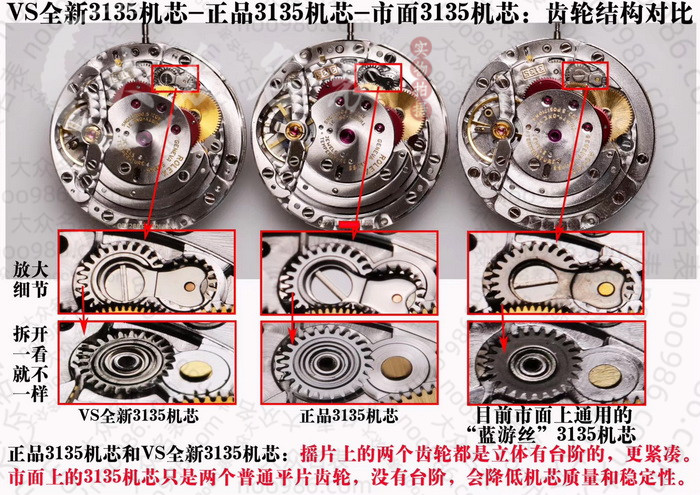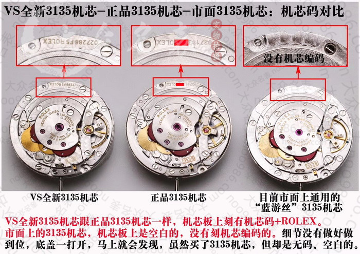 vs全新3135机芯更正品3135机芯一样,机芯板上刻有机芯码+ROLEX。市面上的3135机芯,机芯板上是空白的,没有刻板机芯编码的。细节没有做好做到位,底盖一打开,马上就会发现,虽然买了3135机芯,但确是无码空白的。