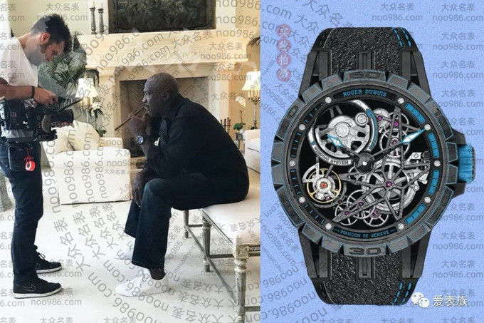 迈克尔·乔丹与众不同的罗杰杜彼Excalibur Spider Pirelli。一款直接用倍耐力轮胎做橡胶表带的汽车运动腕表。。MJ在拍摄有关其芝加哥公牛队传承的最新Netflix纪录片《最后的舞蹈》时佩戴了这只表。