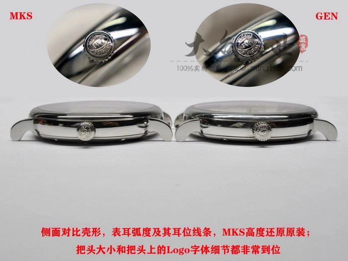 放大来看整体对比: 其实正品的字面呈黑色,但又泛灰色,且有淡淡的一层喷油面做铺垫;而MKS字面工艺处理和正品完全一致,并且也做到了那种黑中泛灰的质感!柏涛的外壳圆润饱满了许多, 正品的蓝宝石镜面采用了双面镀蓝膜处理,MKS的玻璃工艺也与正品完全一致!所以同样的光线下,同一个角度, 字面完全没有色差!光凭这两组图很难辨别真假,如果真要区别,可能也只有江南皮革厂的老板能从表带的材质看出来。从拍摄几组字面对比可以看出条丁刻度做的很饱满,可以称得上是高端的复刻工艺,美中不足的是REP印刷的英文字母要显得略微浅了一点,指针不够圆滑饱满,不过这也是我们如此近的观察才能发现,可以忽略。日历窗口的深度非常的棒、比列和细节都是不错的 REP日历字体比GEN稍微粗了一点。 三根指针加上一个端秀的日期窗口--不多不少、恰到好处,这就是优雅内敛的品味象征。表壳侧面采用打磨、抛光处理,我们可以看到正品的圆润的外壳,MK在修改了这次版本之后也是做到了完全一样。厚度也保持一致, 都是9MM左右。拉进距离,可以看到把头的长短、大小和正品完全一致,加上同结构机芯,把头完全可以互换!表冠位置的LOGO雕刻的很不错,很清晰,立体感十足,周边的纹路也是深浅一致。底盖的刻字字体,完全没有问题,正品的刻字有做喷砂处理,MKS同正品完全一致,唯独CO后面那个点,正品在左下角,MKS在中间,这点是一位客户和我讨论是说起过,不然我还真没注意;底盖中间都同样有打磨呈放射纹!表壳的尺寸和机芯结构一致,可以说MKS的表壳完全和正品可以互换。说句题外话:其实正品柏涛的质感,就那样,奈何人家洞悉市场,定位精准,妥妥的正装销量之王,卖的还不是美滋滋的!表带还是有不同,正品GEN是鳄鱼皮带,有生动整齐的纹路和气孔;复刻REP是小牛皮,纹路也是批量生产出来一致的,毕竟复刻的成本在那儿。如您追求高品质,可找小编订制鳄鱼版本,装B到位。这次MKS的表扣也是投入了心思和成本,因为大多厂家都不会把表扣做的太好,而MKS这次的升级是从头到脚的改变, 做工非常精致。总体来说:此次mks厂柏涛菲诺复刻表通过机芯方面的变更,外观细节方面的提升,和正品对比已经差距越来也小,几乎难辨真假,如果你喜欢正装商务表,强烈推荐。