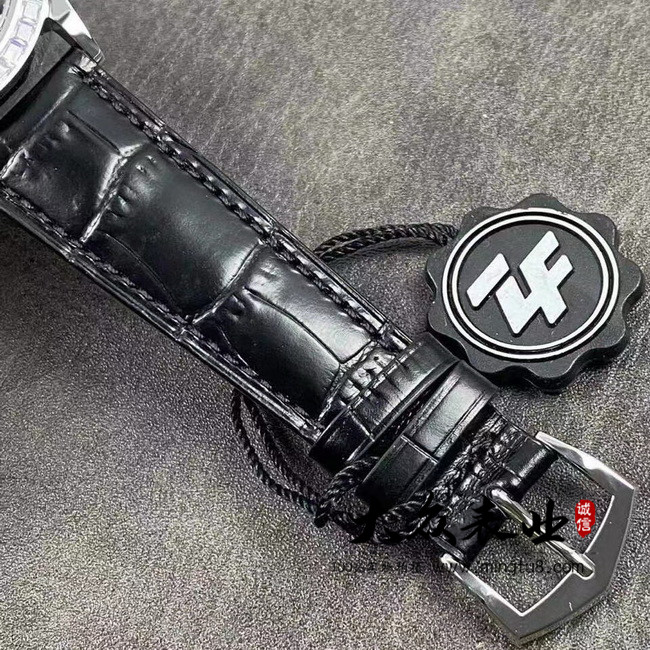 ZF厂百达翡丽盘面上所有的时间刻度都采用条钉结构标识,盘面上的圆点和条钉对的很准,没有任何的偏差。盘面上的字体,刻度清晰立体。指针采用的是经典大三针造型,简洁大方,整体观感非常舒适。三点钟是日历窗口。ZF厂百达翡丽侧面厚度为9毫米,侧面的把头(表冠)的三角坑纹刻度大小均匀有致,调节时间非常的方便。把头顶端镌刻有百达翡丽的品牌LOGO,镌刻的非常清晰完整。侧面壳身经过拉丝抛光处理,光泽明亮,完美复刻正品。ZF厂的机芯采用9015机芯,由于之前机芯没有装载夹板,导致和正品有一些差别,这次ZF厂在机芯上贴了一张夹板,不会出现一眼假。ZF厂百达翡丽表带搭配经典的黑色意大利小牛皮表带,针式表扣打磨十分齐整光亮,表扣上的刻字也是清晰可见,可以做到和正品互通的效果。