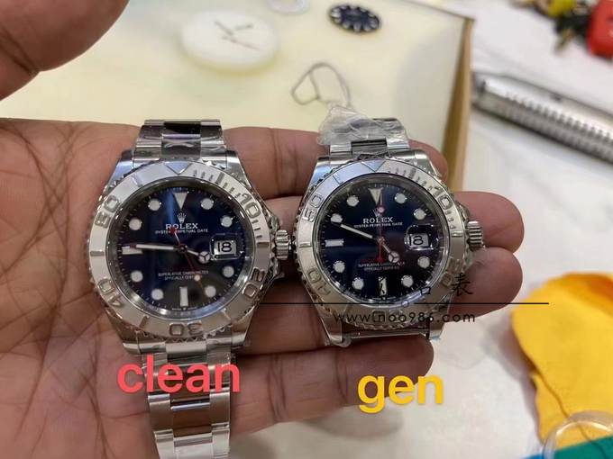 1.左侧/右侧GEN=真品 clean=clean厂产品。2.左侧灰色面因为在柔光箱中,显得色差有些大,但是在自然光线下,相似程度高达95%以上,后面会放出自然光对比。3.右侧蓝色面,c厂相较于真品而言,蓝色略浅一些,当然了,放射纹盘面的特点就是在不同的光线下呈现出的颜色不一样,准确说,RGB色值在一个基准上,整体就不会有太大的偏差。因为c厂在整个放射纹表盘上,例如水鬼盘,各种日志盘,以及本次游艇盘,涉及到色彩放射纹的,均采用同真品一致的PVD电镀工艺,优点就是保证出货颜色不会因为批次不同,而色调上产生差异化。另外就是镀层薄,能够清晰看到底面的太阳纹路,但是就是成本高。4.本次圈口采用电镀pvd白金+防指纹镀膜,圈口材质也一般的黄铜更改为精钢材质,也就是说,即使圈口有磕碰,电镀层破坏,露出底色,他也是和白金色是一样的,但是精钢硬度高于一般铜材。也是在加工和成本上卯足了劲。