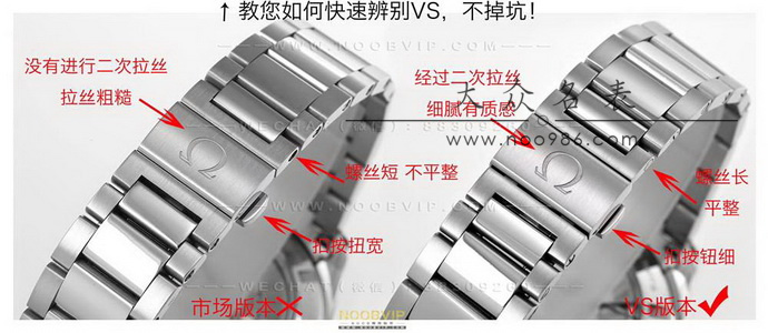 市场版本没有进行二次拉丝,拉丝粗糙。螺丝短,不平整,扣按扭宽。vs版本经过二次拉丝细腻有质感,螺丝长平整,扣按扭细。