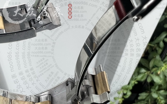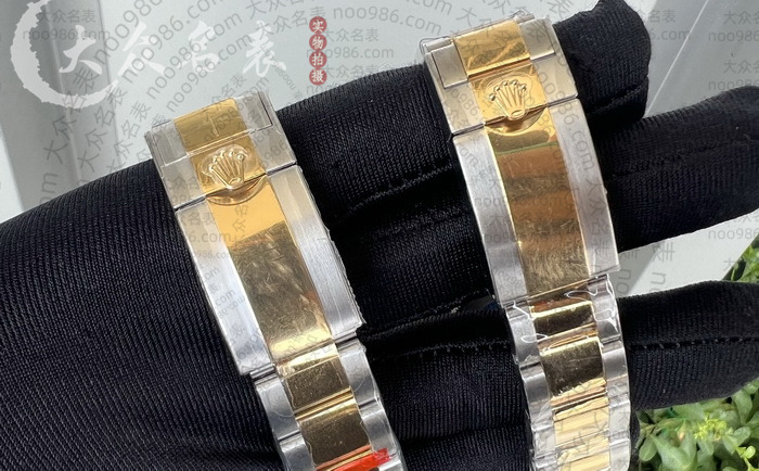 表带工艺方面,贵的厂家在细节成本会更高,比如这种间金带,C厂侧面没有露白,都是有金色覆盖包裹。便宜的加工厂为了增加生产效率降低并没有每节拆开做上色。