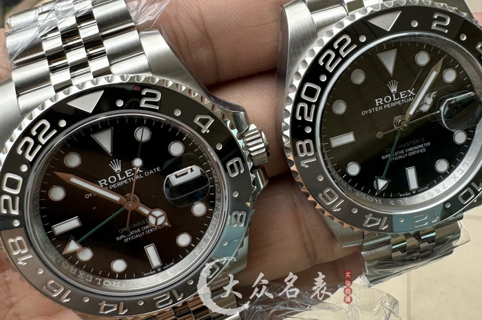 clean本次推出的新款126710我们拿到了真品+样板,详细的拍摄了细节对比,先说黑灰陶瓷圈,首先黑色肯定是100%没问题,灰色部分,clean灰色相对而言做的比真品略微深色一些。但是对比126713的灰色已经有显著提升。并且灰色部分在不同角度呈现出的灰色饱和度也不一样。但是相似度也达到了95%以上。对于clean的调色技术在这么短的时间内已经是非常出色了。