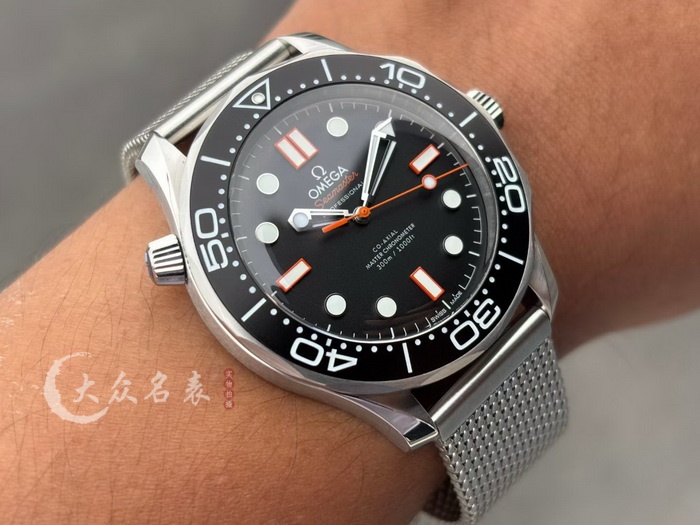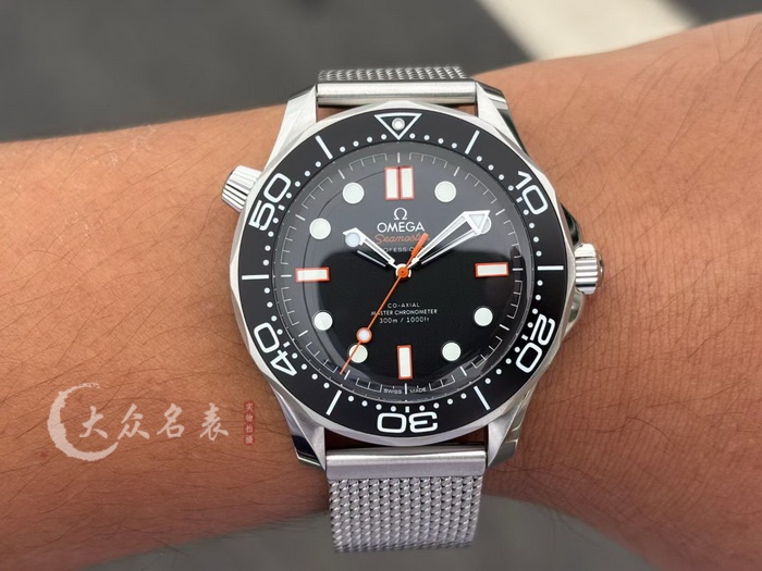 在前不久,欧米茄终于将海马系列中最具代表性,且极为靓丽的橙色加入到了无历海马300米的表款中。最近流行的多彩设计,不得不让我想到是几年前劳力士的彩色恒动带起的风潮。这款海马300对橙色的使用选择了令人欣喜的克制,只以点缀的方式出现在了秒针、标识和3、6、9、12的时标上,因为对于像海马300米这样一款偏优雅的潜水表而言,如果使用橙圈就实在过于炸裂了,也不用经常被人说是劳力士的追随者。