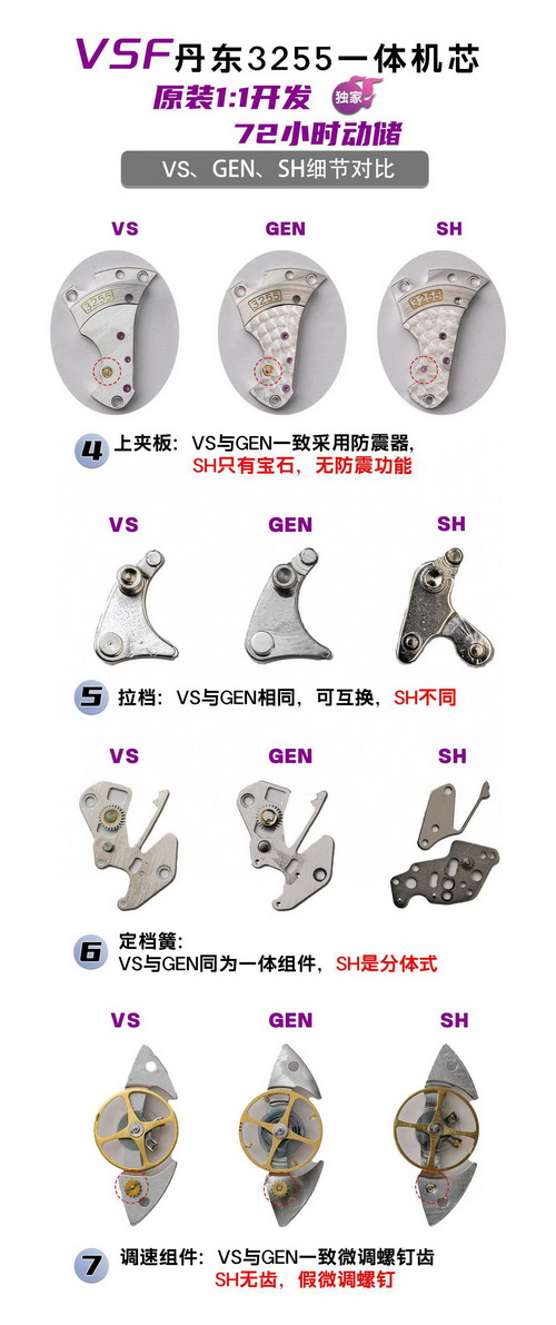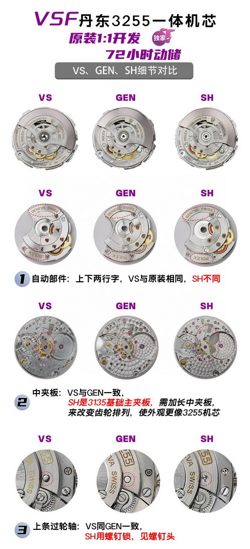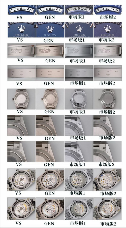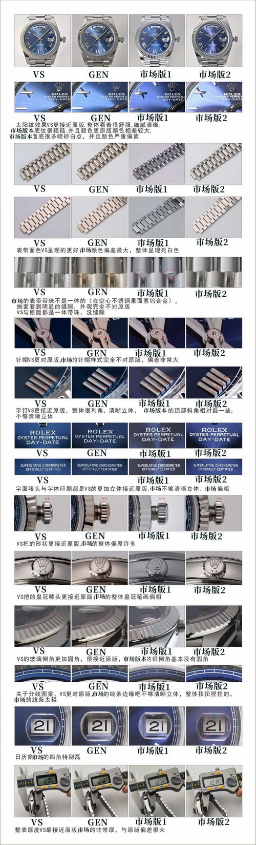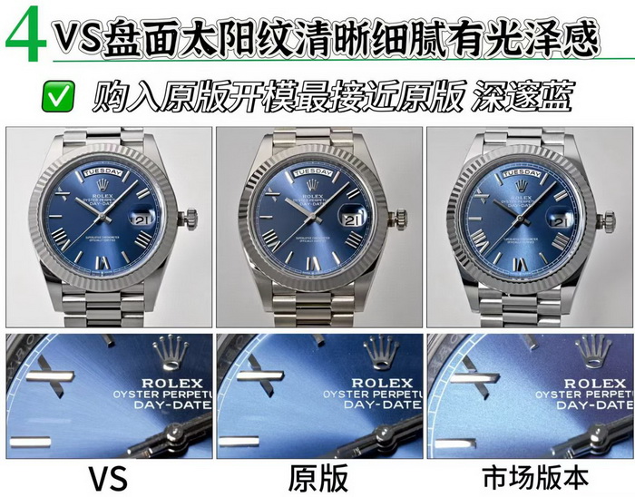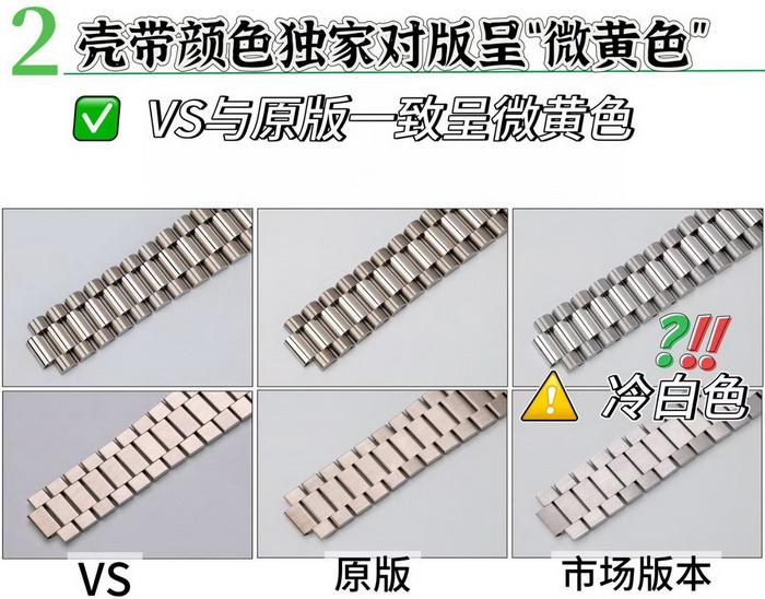 太阳纹效果VS更加接近原版,整体看着舒服,细腻清晰,市场版本底纹很粗糙,并且颜色更原版颜色相差较大,市场版本面底很多喷砂白点,并且颜色严重偏紫色。表带面色VS呈现的更好,市场颜色偏差最大,整体呈现死白色,市场的表带表珠不是一体的(在空心不锈钢里面塞钨合金)。侧面看到明显的缝隙,外观完全不对原版,VS厂与原版都是一体带珠,没有缝隙。