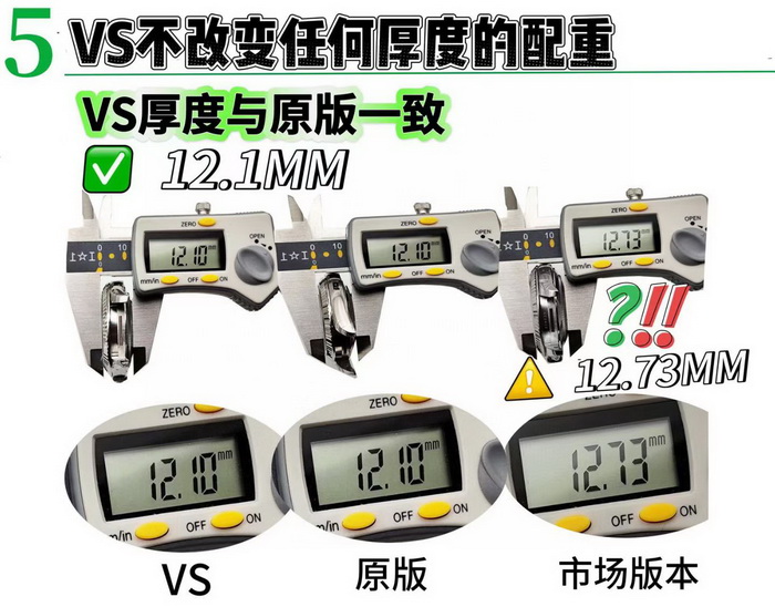 5️厚度:VS 与原版一致12.1MM 不为了配重而加厚底盖尺寸的做法。VS 始终保持外观一致的配重。❌为达重量加厚底盖12.7