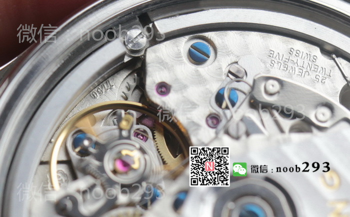 看看避震的宝石,左边是加减档(用作调节误差),宝石呈红色,游丝下面就是机芯的钢印。机芯我就不啰嗦了,会看的一眼就知道什么货,反正机芯图大家有兴趣百度,上面很多的。反正我亲自验明机芯无问题就对了。